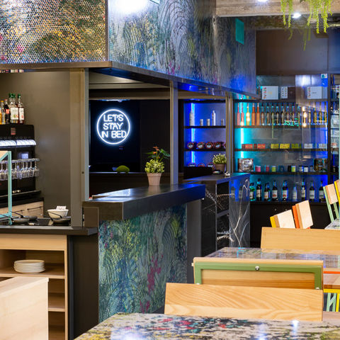L'aménagement a été imaginé tel une vibration, une déflagration intérieure donnant naissance à un univers pop et foisonnant.