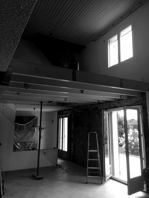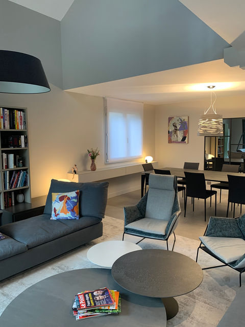 Percer la cloison, séparant la cuisine, et implanter une verrière a permis d’amener de la profondeur à l’espace, créant ainsi une perspective sur tout le volume du rez de jardin. Le calepinage de cette verrière de style industriel, donne du rythme et élance le regard. La porte coulissante s’efface reliant les espaces au gré des envies des occupants.