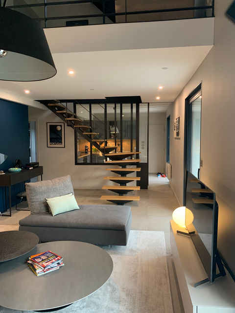 L’escalier, maintenant placé au centre de l’aménagement, devenant la pièce maitresse, se veut léger, compact et confortable. Nous avons imaginé un ouvrage aérien, en structure acier, et marches bois. L’unicité des matières entre verrière et escalier créé un ouvrage sculptural unique. Le bleu profond de la boîte technique parfait le décor d’une note classieuse.